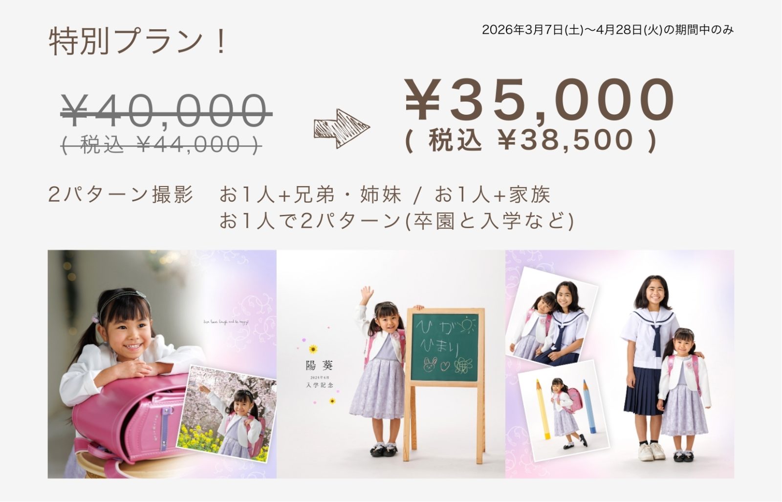 例:卒園・卒業記念は事前に撮影をして、入学式当日に入学記念としてお一人または家族撮影をすることも可能です。
