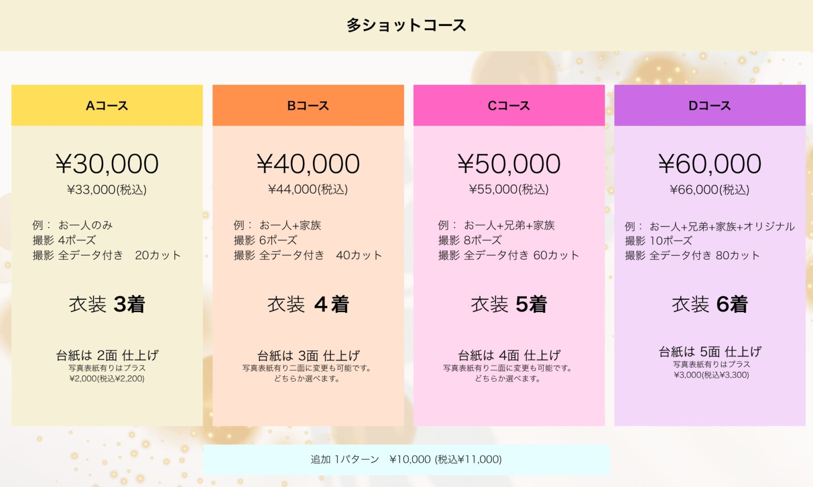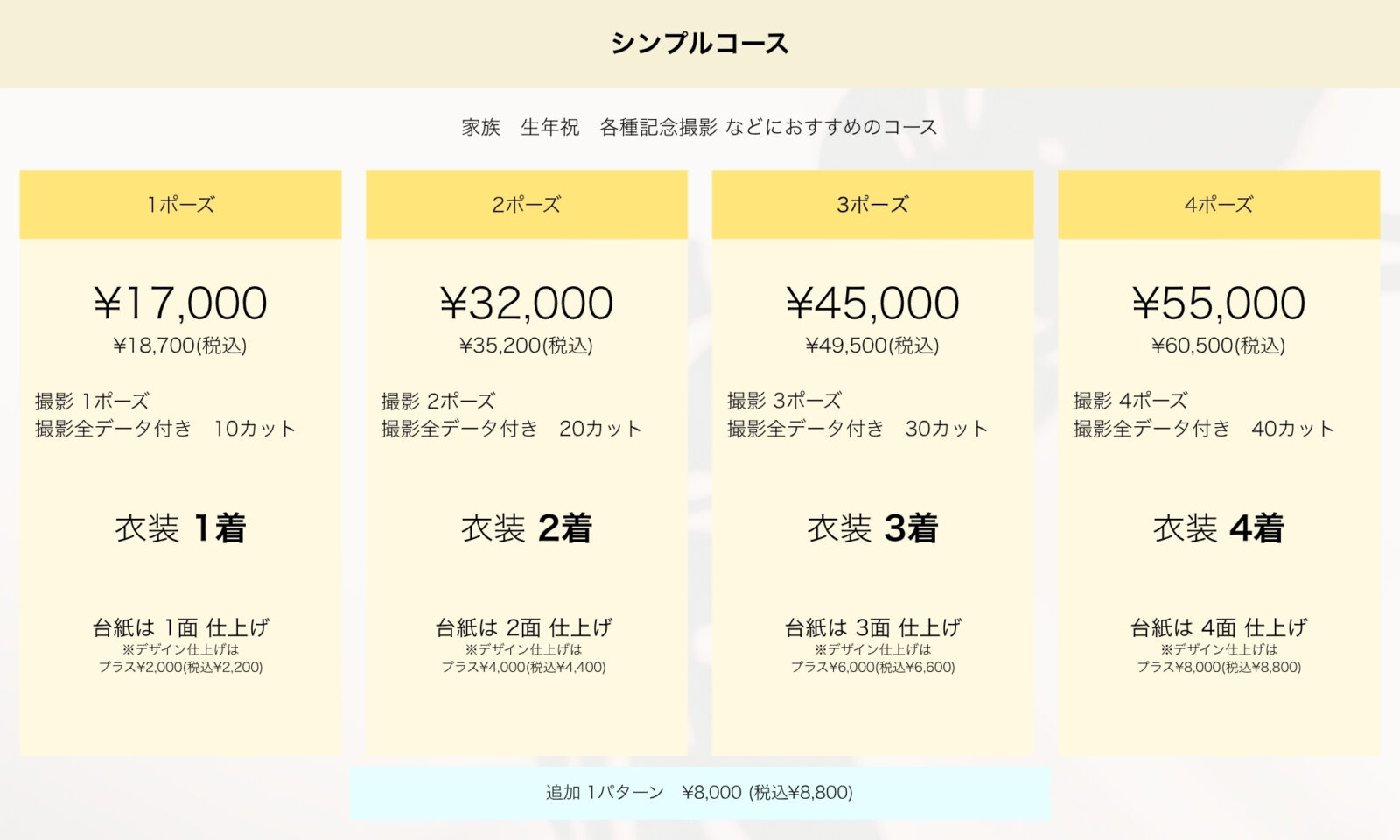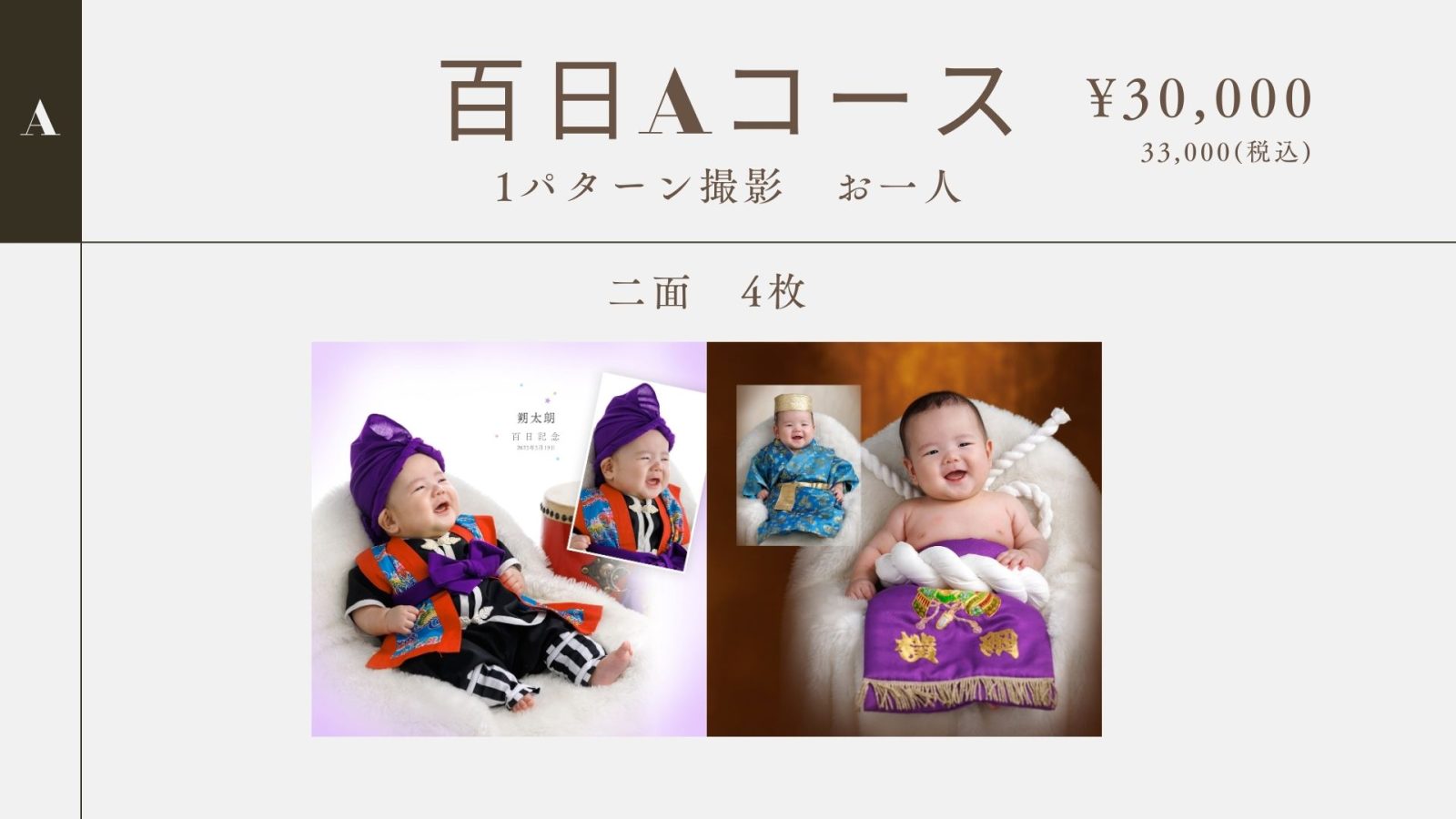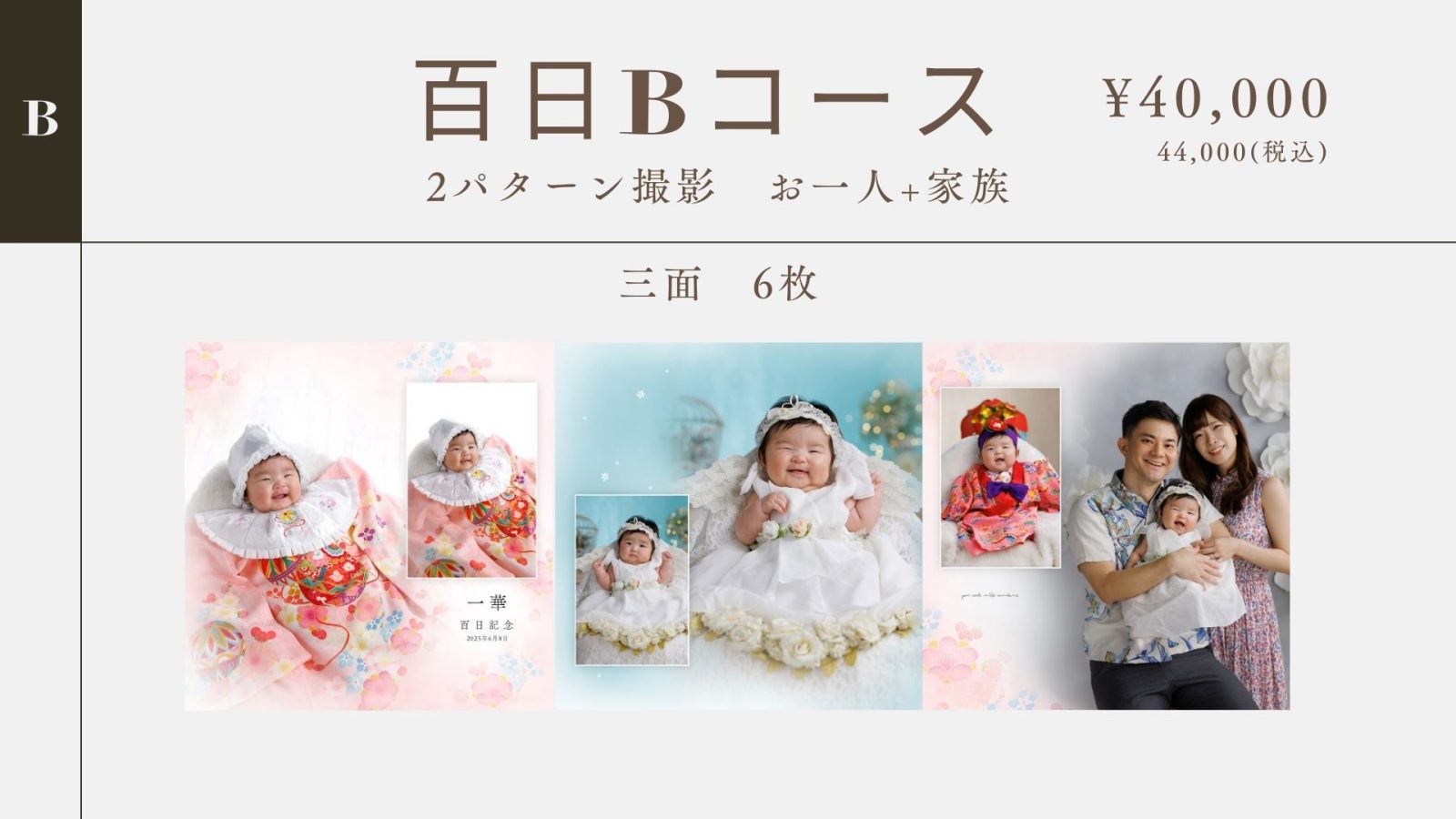 ※百日記念撮影メニュー内容は、6ヶ月未満を対象とした料金・内容となります、6ヶ月以降はハーフバースデーメニューでのご案内とさせていただきます。